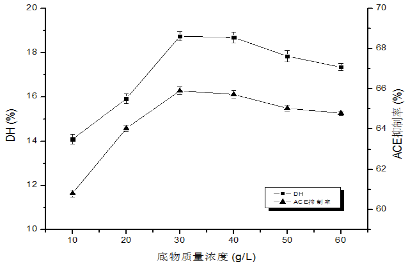 以核桃降壓肽的ACE抑制率和水解度為指標分別考察雙酶復配配比、底物質量濃度(g/L)、酶添加量(U/g)、三個因素對核桃降壓肽制備的影響,進行單因素實驗。
