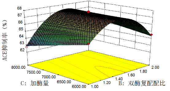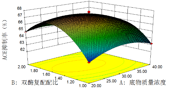 利用Design-Expert 8.0軟件進行工藝參數的優(yōu)化組合,得到堿性蛋白酶-風味蛋白酶分步酶解核桃蛋白制備ACE抑制肽的**佳工藝為:底物質量濃度28.80g/L、加酶量6000U/g、雙酶復配配比3:2,ACE抑制率可達到67.7217%。根據實驗室條件調整酶解工藝為底物質量濃度29g/L、加酶量6000U/g、雙酶復配配比3:2,得到的實際抑制率67.05%。