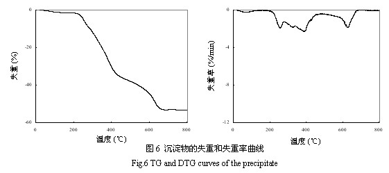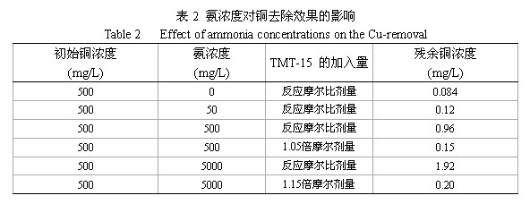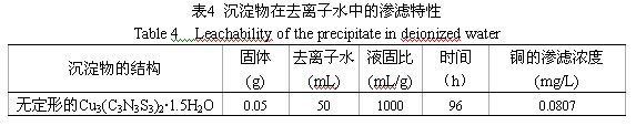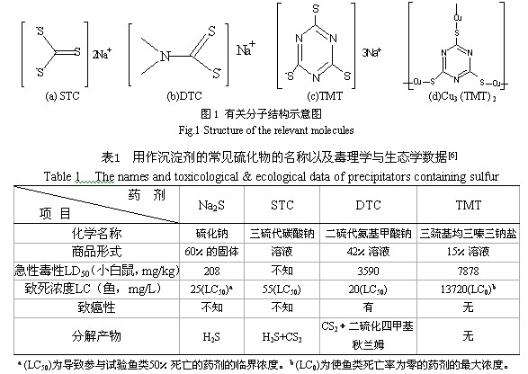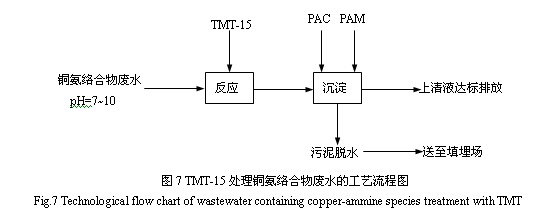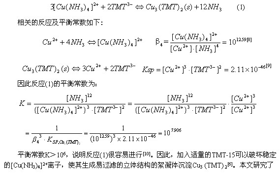 含銅廢水主要來(lái)自印刷電路板、金屬的漂洗和電鍍、紙漿制作等行業(yè)[1]。過(guò)量的銅會(huì)產(chǎn)生危害并有致突變作用[2],用含銅廢水灌溉農(nóng)田,銅可在土壤和農(nóng)作物內(nèi)累積,產(chǎn)生危害[3]。為了控制銅等重金屬對(duì)水體的污染,保護(hù)地面水和地下水水質(zhì)的良好狀態(tài),我G政府制定了統(tǒng)一的污水排放標(biāo)準(zhǔn),其中總銅的一級(jí)排放標(biāo)準(zhǔn)為0.5mg/L[4]。 當(dāng)廢水中含有絡(luò)合劑如NH3、EDTA、磷酸酯、檸檬酸鹽和天然有機(jī)酸時(shí),它們將與銅離子配位形成非常穩(wěn)定的可溶性絡(luò)合物,從而干擾傳統(tǒng)工藝對(duì)銅的處理[5]。以印制電路工業(yè)為例,目前印刷電路板的腐蝕多數(shù)采用堿氨蝕刻液。該蝕刻液借助氧化、溶解和配合等化學(xué)過(guò)程,將印制電路板上露出的銅以二氯化四氨合銅的形式溶解下來(lái),其總反應(yīng)為: ![]() 這樣,電路板經(jīng)堿性蝕刻后產(chǎn)生了大量的含銅清洗廢水和回收尾液。此類廢液偏堿性,NH3較多,銅以較穩(wěn)定的銅氨絡(luò)合物形式存在。采用混凝、中和沉淀、吸附、電解、微生物法等處理方法,難以達(dá)到良好的去除效果或處理成本太高。而采用硫化物沉淀法處理含絡(luò)合劑的重金屬?gòu)U水,由于各種重金屬硫化物的溶度積都非常小,重金屬的去除效果很好。常用的硫化物分無(wú)機(jī)硫(硫化鈉)與有機(jī)硫(STC、DTC和TMT)兩大類,有關(guān)分子結(jié)構(gòu)見(jiàn)圖1,它們的生態(tài)學(xué)及毒理學(xué)數(shù)據(jù)見(jiàn)表1。 ![]() 從表1中可以看出,與TMT相比,硫化鈉、STC和DTC的毒性較大,特別是DTC更具有生物殺傷性,曾經(jīng)由于它的過(guò)量投加,殺死了從Anderson 到 Indianapolis的50英米流域內(nèi)的117噸魚(yú)[7]。TMT常見(jiàn)的商品形式為15%的水溶液,俗稱TMT-15,它在20℃時(shí)的密度為1.12g/mL[6]。可見(jiàn),當(dāng)每立方米廢水中含有高達(dá)12000mLTMT-15時(shí),仍不會(huì)對(duì)魚(yú)類的生存造成任何不良影響,因此,TMT是一種環(huán)境友好型有機(jī)硫藥劑。在含有[Cu(NH3)4]2+的廢水中加入TMT-15時(shí),發(fā)生以下反應(yīng): ![]() 用TMT-15處理含銅氨絡(luò)合離子廢水的影響因素,用元素分析、紅外與X衍射等手段表征了生成的沉淀,并對(duì)它的熱穩(wěn)定性與在去離子水中的滲濾特性作了初步探討。 1 試驗(yàn)部分 1.1 試劑 固體Na3(C3N3S3)•9H2O(即TMT)為美GAldrich公司出品,將33.32g 的Na3(C3N3S3)•9H2O 晶體溶解于100g 的去離子水中,即為TMT的15%水溶液,俗稱TMT-15。其余所涉及的化學(xué)品皆為分析純,實(shí)驗(yàn)所用的水都為新鮮的去離子水,其電導(dǎo)率小于0.7μs/cm。 1.2 主要儀器 實(shí)驗(yàn)中pH值的測(cè)定是由Hanna pH 211型ph計(jì)與E-201-C-6型復(fù)合電極完成的,采用的pH定位液(4.01、6.86 和9.18)由上海雷磁公司出品。熱重分析采用Setaram Setsys-16 TA儀,實(shí)驗(yàn)在99.999%的氮?dú)夥諊羞M(jìn)行,氣體流速為50mL/min,溫度范圍為20-800℃,程序升溫速率為10℃/min。紅外分析采用KBr壓片法在Nicolet-Nexus 670紅外光譜分析儀上進(jìn)行。采用日本理學(xué)D/max—rA型衍射儀進(jìn)行物質(zhì)的晶相結(jié)構(gòu)分析,以Cu靶的Kα1 (λ= 1.540598 Å)為輻射源,工作電壓40kV,掃描范圍為2θ=10°~90°,掃描速度為8°/min。C、H、N、S的分析在Flash EA 1112 Series型元素分析儀上進(jìn)行。銅濃度的測(cè)定在Iris Interpid Ⅱ XSP型電感耦合等離子發(fā)射光譜儀(ICP-AES)上進(jìn)行。 1.3 試驗(yàn)方法 1.3.1 殘余銅濃度的測(cè)定 在研究影響銅去除效果因素的試驗(yàn)中,我們配制了含不同銅和氨濃度的溶液各100mL,分別加入一定量的TMT-15藥劑,絮凝劑(聚合氯化鋁PAC)和助凝劑(聚丙烯酰胺PAM)后,靜置一定時(shí)間,取上清液用ICP-AES儀測(cè)定其殘余的銅濃度。 1.3.2 沉淀產(chǎn)物的制備 為了較好地研究TMT螯合沉淀法所生成的沉淀,我們結(jié)合現(xiàn)場(chǎng)的實(shí)際,按下述實(shí)驗(yàn)條件制備了研究所用的沉淀物。我們配制溶液的銅初始濃度為500 mg/L,氨濃度為500 mg/L,按反應(yīng)(1)的物質(zhì)摩爾比(TMT與Cu的摩爾比為2:3)加入一定量的TMT-15后,立即生成紅棕色沉淀,不加入任何絮凝劑與助凝劑,攪拌30分鐘后,將此沉淀過(guò)濾,用水和乙醇沖洗數(shù)遍后,先在室溫下干燥,然后放入烘箱在130°C下干燥6h,即得到我們的研究對(duì)象。 1.3.3 沉淀產(chǎn)物的滲濾性實(shí)驗(yàn) 用Mettler Toledo AB204-E型的電子天平準(zhǔn)確稱取干燥后的沉淀產(chǎn)物0.05 g,放入已裝有50mL去離子水的容量瓶中,室溫條件下在往復(fù)式水平振蕩機(jī)上連續(xù)振蕩96h,振蕩頻率為110±10次/min,振幅為40mm,靜置后用0.45μm.的濾膜過(guò)濾,用ICP-AES儀測(cè)濾液中銅濃度。 2 結(jié)果與討論 2.1 影響銅去除效果的因素研究 2.1.1 氨濃度對(duì)銅去除效果的影響 我們用CuCl2和氨水配制了四種氨濃度不同的溶液各100mL,其中銅離子濃度均為500mg/L,而NH3的濃度分別為0、50、500和5000mg/L。然后按化學(xué)反應(yīng)摩爾比的劑量(TMT與Cu的反應(yīng)摩爾比為2:3)加入TMT-15,靜置30min后,取上層清液測(cè)定剩余銅濃度,結(jié)果見(jiàn)表2。從表2中可以看出,在銅的初始濃度與TMT-15的加入量都相同的條件下,溶液中絡(luò)合劑氨的濃度越高,處理后的殘余銅濃度也越高,銅的去除率下降。對(duì)于這