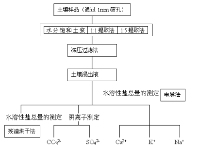 ① 水溶性鹽的浸提; ② 測(cè)定浸出液中鹽分的濃度。制備鹽漬土水浸出液的水土比例有多種,例如1:1、2:1、5:1、10:1和飽和土漿浸出液等。P 179